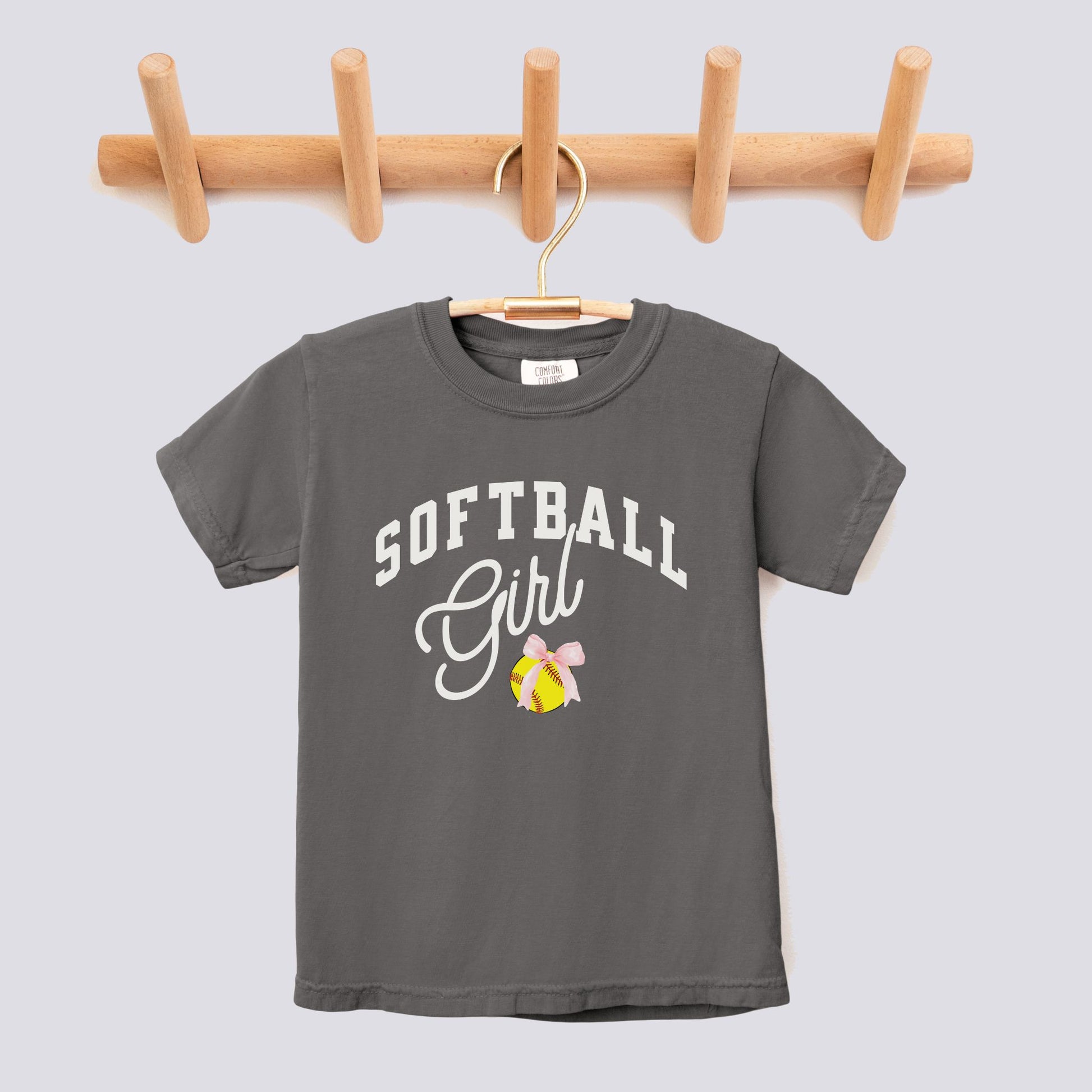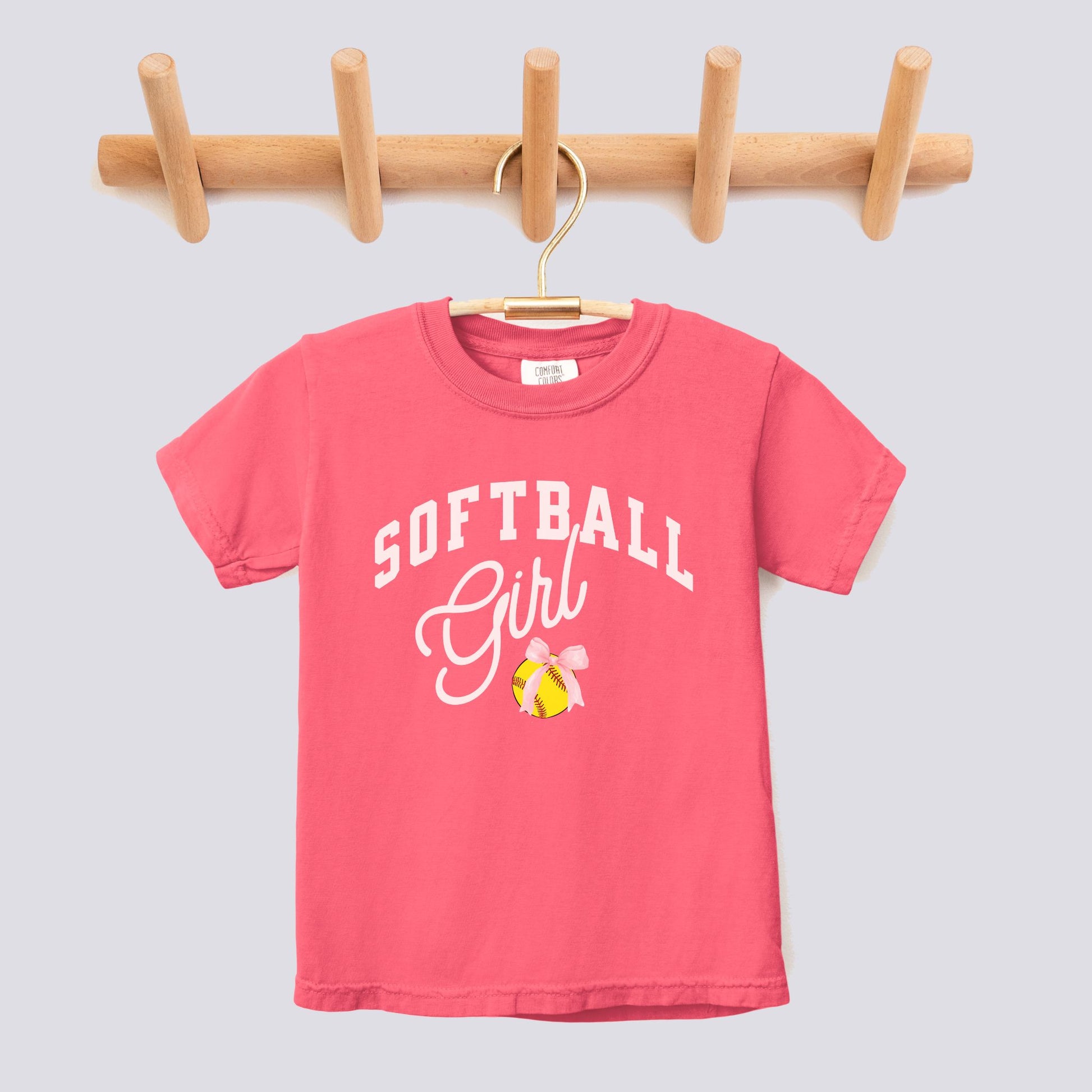 Retro Softball Girl Pink Bow Comfort Colors Youth Tee