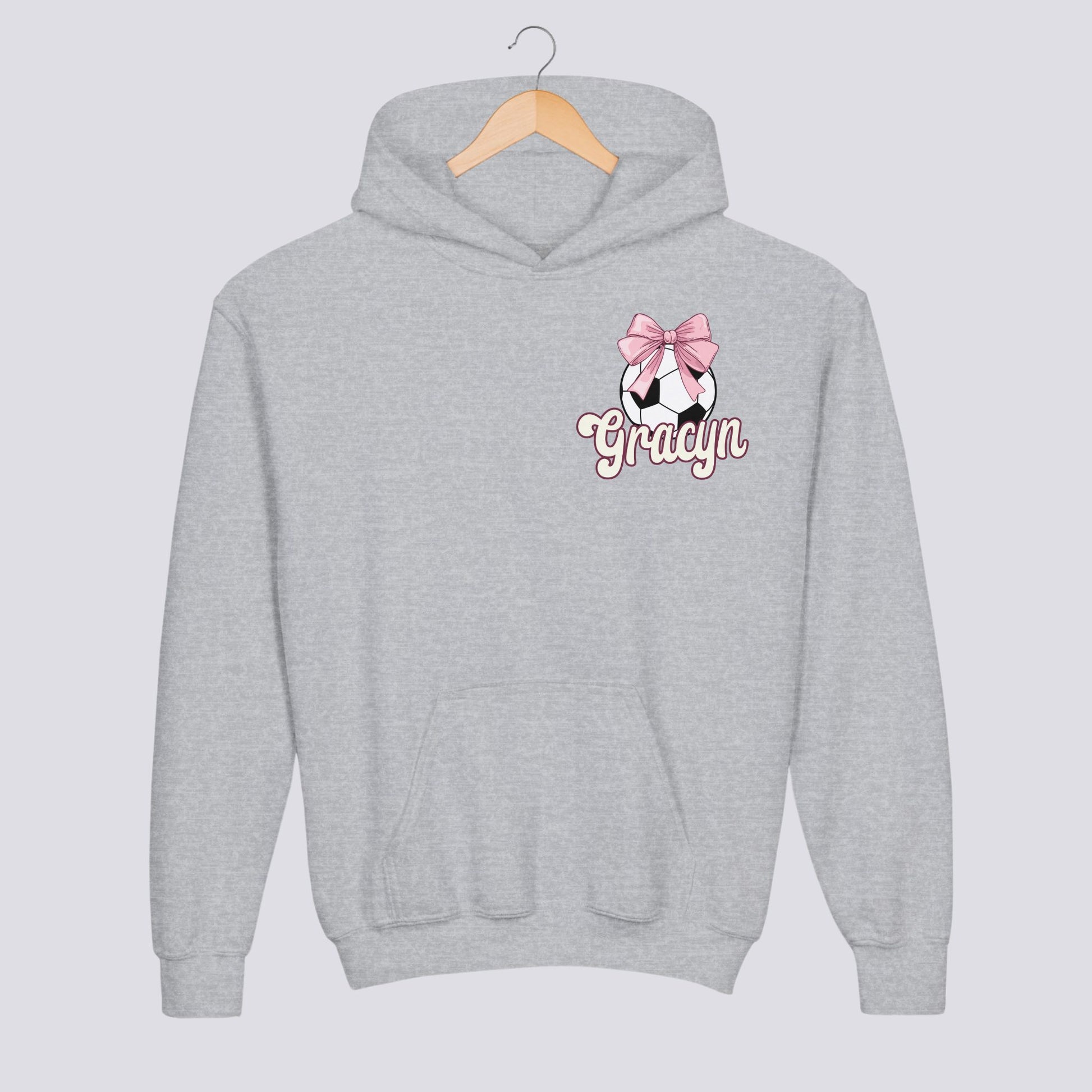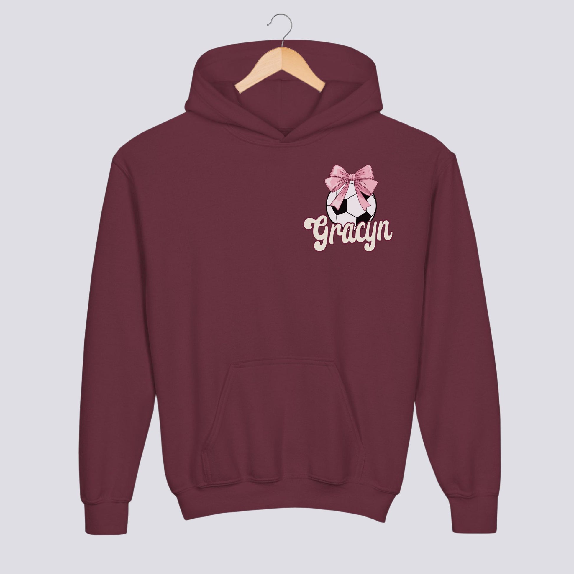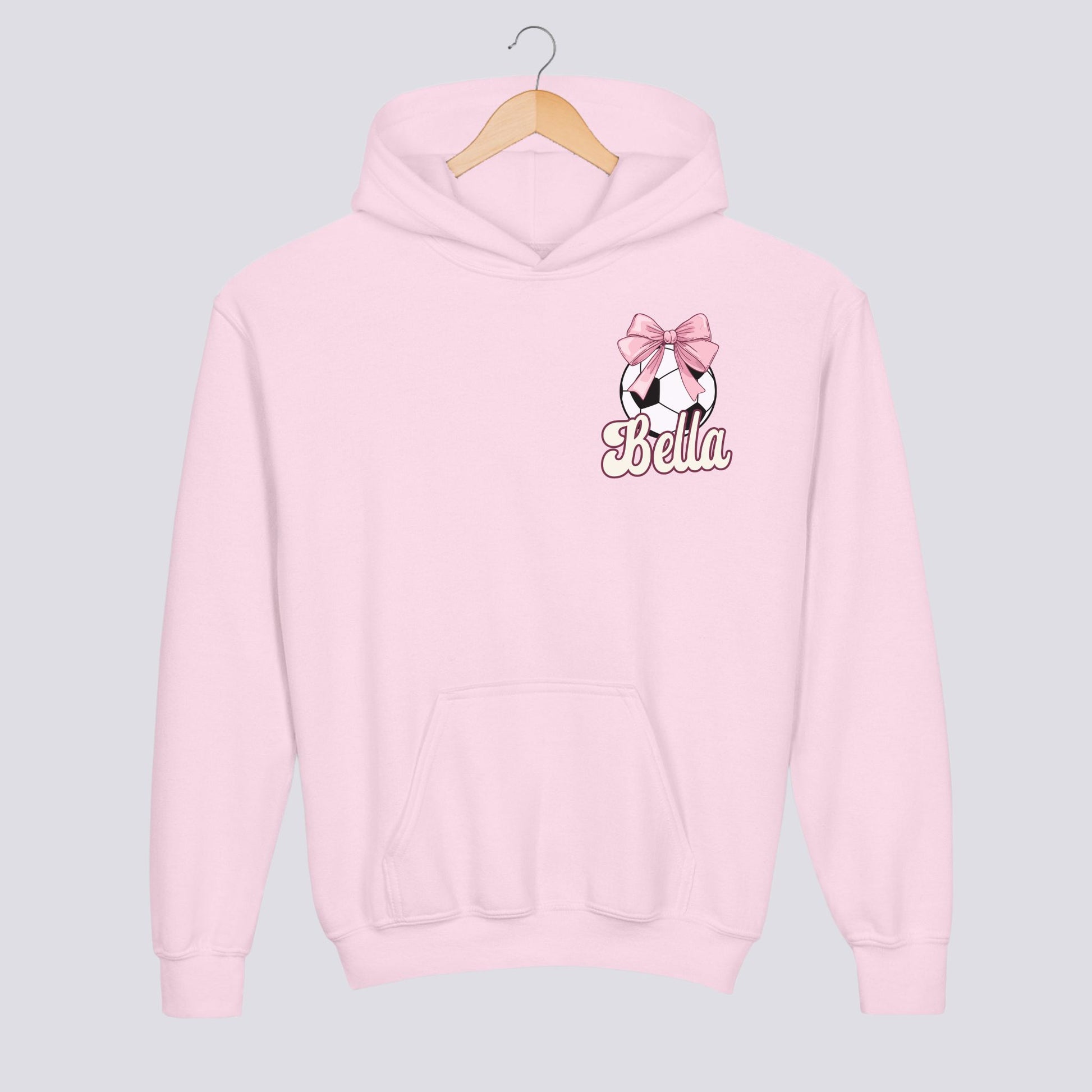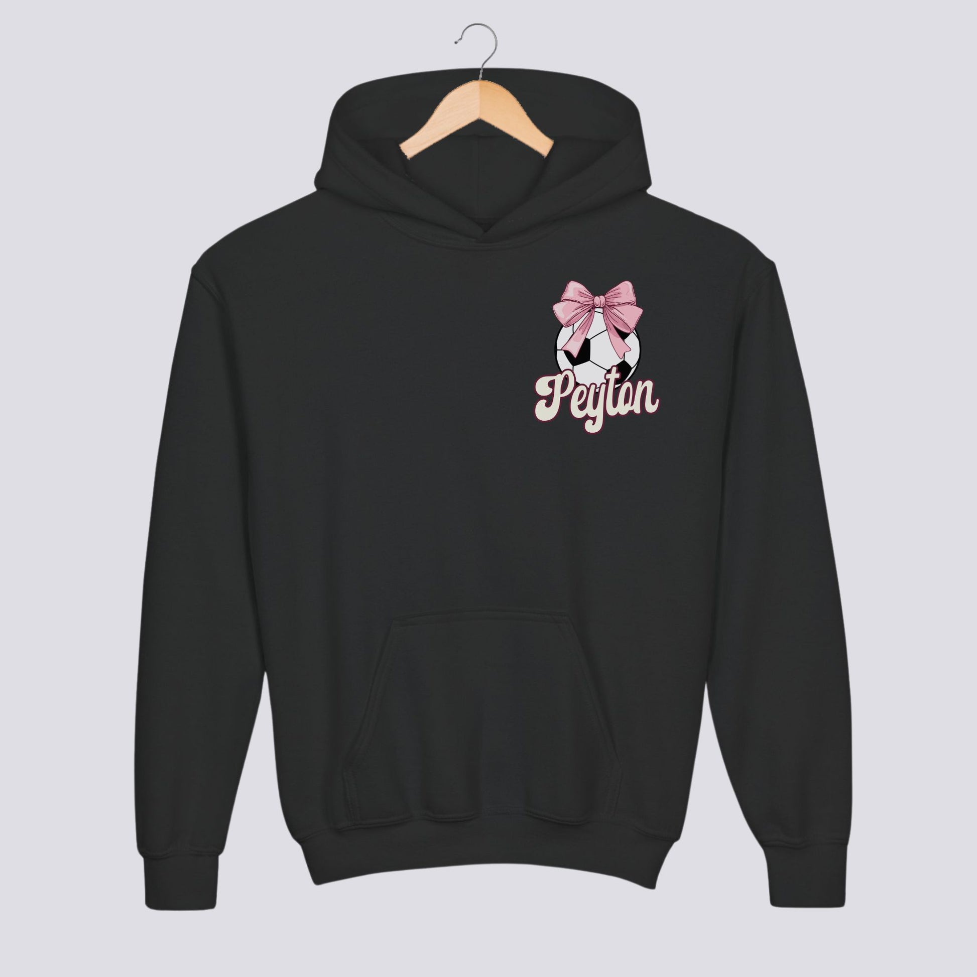 The back design — blending soccer balls with cute pink bows — strikes the perfect balance between sporty energy and girly charm, so she can show her team spirit with confidence and personality. Made from a durable cotton/poly blend, this hoodie is built to handle active play, frequent washes, and everyday adventures. Reinforced neck tape helps maintain the hoodie’s shape season after season.